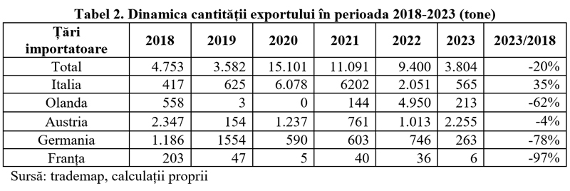 Așa cum reiese din datele centralizate, valoarea totală a exporturilor a înregistrat o creștere de la 1.723 mii euro în 2018 la 1.889 mii euro în 2023. Deși creșterea agregată este de aproximativ 9,6%, se remarcă o volatilitate anuală semnificativă. Italia se confirmă ca o piață strategică, înregistrând o ascensiune de 160%, ceea ce sugerează o orientare a producătorilor români către destinații unde calitatea produsului este valorificată superior.