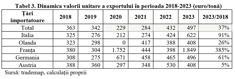 Se observă o creștere robustă a valorii unitare, de 91% în cazul Italiei (ajungând la 622 euro/tonă) și de 61% în Germania (496 euro/tonă). Această evoluție sugerează o mai bună poziționare a produsului românesc pe aceste piețe și o aliniere la tendințele inflaționiste ale prețurilor externe.