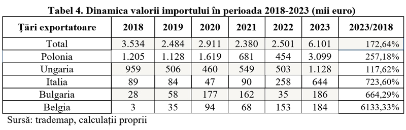 Tabelul 4 evidențiază o transformare structurală a aprovizionării pieței naționale în perioada 2018–2023. Valoarea totală a importurilor a crescut de la 3.534 mii euro la 6.101 mii euro, marcând o ascensiune de 72,64%. Această evoluție indică o dependență tot mai pronunțată față de furnizorii externi pentru a acoperi consumul intern de fasole. Astfe, Polonia își consolidează poziția de principal furnizor, cu o creștere a valorii de peste 2,5 ori (+157,18%). Saltul spectaculos înregistrat în anul 2023 (3.099 mii euro) sugerează că Polonia a preluat mare parte din cererea neacoperită de producția internă, beneficiind de prețuri competitive și lanțuri logistice eficiente. Italia și Bulgaria prezintă dinamici remarcabile, cu creșteri de 623,60% (Italia) și 564,29% (Bulgaria). Aceste cifre indică o reorientare a fluxurilor de aprovizionare către piața balcanică și cea mediteraneană, posibil datorită proximității (în cazul Bulgariei) sau a importului de varietăți de fasole cu valoare adăugată mai mare, preferate de consumatorii urbani. Ascensiunea spectaculoasă a importurilor din Belgia, de peste 60 de ori în intervalul analizat, reflectă o diversificare a pieței locale către produse cu valoare adăugată ridicată, precum fasolea ecologică sau procesată, Belgia servind drept principal hub logistic pentru segmentul premium din Europa de Vest. Ungaria prezintă o evoluție constantă, cu o dublare a valorii în 2023 față de minimele din 2020, confirmând rolul său de partener comercial tradițional și stabil.