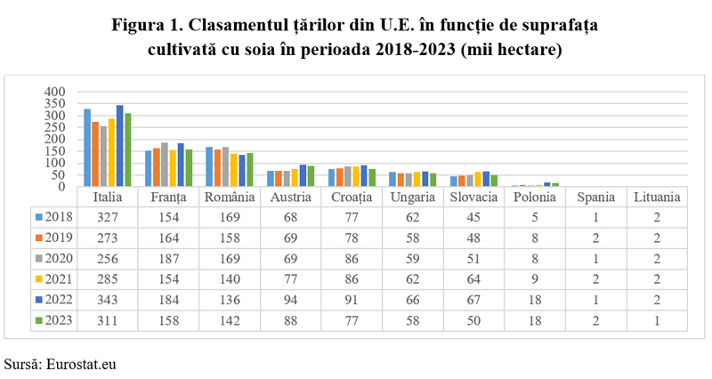 În clasamentul țărilor din Uniunea Europeană, în funcție de suprafața cultivată cu soia, Italia se menține pe primul loc, cu un total de 303,1 mii hectare, evidențiindu-se ca principal producător la nivel european. România ocupă poziția a doua, cu o suprafață de 154,83 mii hectare, deși aceasta a înregistrat o ușoară scădere față de anul 2018, când suprafața cultivată ajungea la 169,4 mii hectare. Această evoluție indică anumite fluctuații în dinamica culturii de soia la nivel național.