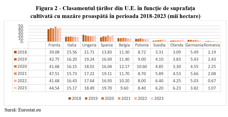 În perioada 2018–2023, evoluția suprafețelor cultivate cu mazăre proaspătă în principalele țări ale Uniunii Europene evidențiază poziția dominantă a Franței, care ocupă constant primul loc. Suprafața cultivată în această țară variază între 39,08 mii ha în 2018 și atinge un maxim de 47,51 mii ha în 2021. Italia, Ungaria și Spania se situează pe poziții intermediare, cu valori cuprinse între aproximativ 13 și 22 mii ha, înregistrând fluctuații moderate. De asemenea, se observă un vârf general în anul 2021, urmat de o tendință de scădere în anii următori, similară celei din Franța. În schimb, România ocupă ultima poziție în clasament, caracterizându-se prin suprafețe foarte reduse cultivate cu mazăre proaspătă, situate între 0,67 și 2,43 mii ha. După anul 2019, se remarcă o scădere constantă a acestor suprafețe, ceea ce reflectă o importanță redusă a acestei culturi în cadrul agriculturii naționale.