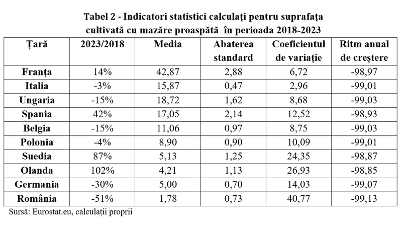 Analiza indicatorilor statistici pentru perioada 2018–2023 evidențiază o evoluție neuniformă a suprafețelor cultivate cu mazăre proaspătă la nivelul țărilor analizate, caracterizată atât prin creșteri semnificative, cât și prin scăderi accentuate. Astfel, deși unele state au înregistrat creșteri ale suprafețelor în 2023 față de 2018, precum Olanda (102%), Suedia (87%), Spania (42%) și Franța (14%), majoritatea țărilor prezintă tendințe de reducere. Cele mai pronunțate scăderi se regăsesc în România (-51%), Germania (-30%), Ungaria (-15%) și Belgia (-15%), ceea ce sugerează o diminuare a importanței acestei culturi în structura agricolă a acestor state.