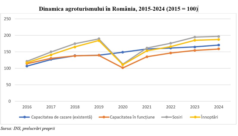 Cererea turistică a avut o evoluție chiar mai dinamică. Numărul sosirilor în pensiunile agroturistice aproape s-a dublat, de la 672.756 turiști în 2015 la 1.323.848 turiști în 2024, cu un ritm mediu anual de creștere de 7,8%. Numărul înnoptărilor a crescut, la rândul său, de la 1,37 milioane la 2,56 milioane, ceea ce confirmă interesul tot mai mare pentru turismul rural.