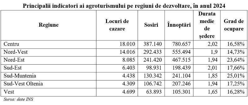 Regiunea Centru rămâne principalul pol al agroturismului românesc, concentrând cele mai mari volume de capacitate de cazare, sosiri și înnoptări. Aceasta are o bază turistică matură și relativ stabilă. În schimb, regiunile Nord-Vest, Sud-Est și Sud-Vest Oltenia se remarcă prin ritmuri accelerate de creștere, ceea ce indică o extindere rapidă a infrastructurii agroturistice și a cererii turistice.