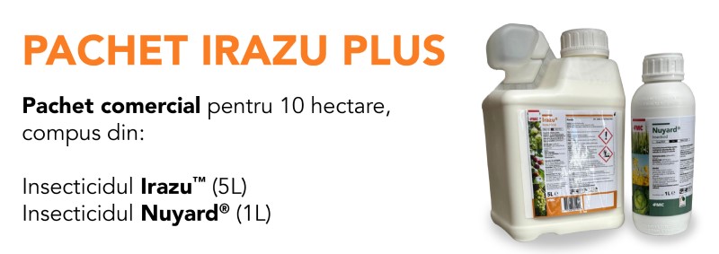 - Insecticidul Irazu™ este comercializat de către compania noastra în pachetul comercial Irazu™ Plus, pentru 10 hectare, compus din insecticidele Irazu™ (5L) și Nuyard® (1L).